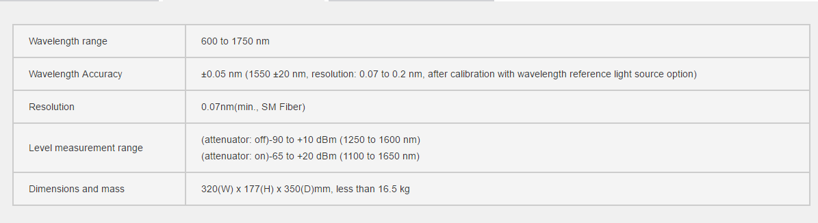 除了用來(lái)測(cè)量LD和LED的光譜外,它還可以用來(lái)測(cè)量無(wú)源光器件的傳輸特征以及光纖放大器系統(tǒng)的噪音系數(shù)。